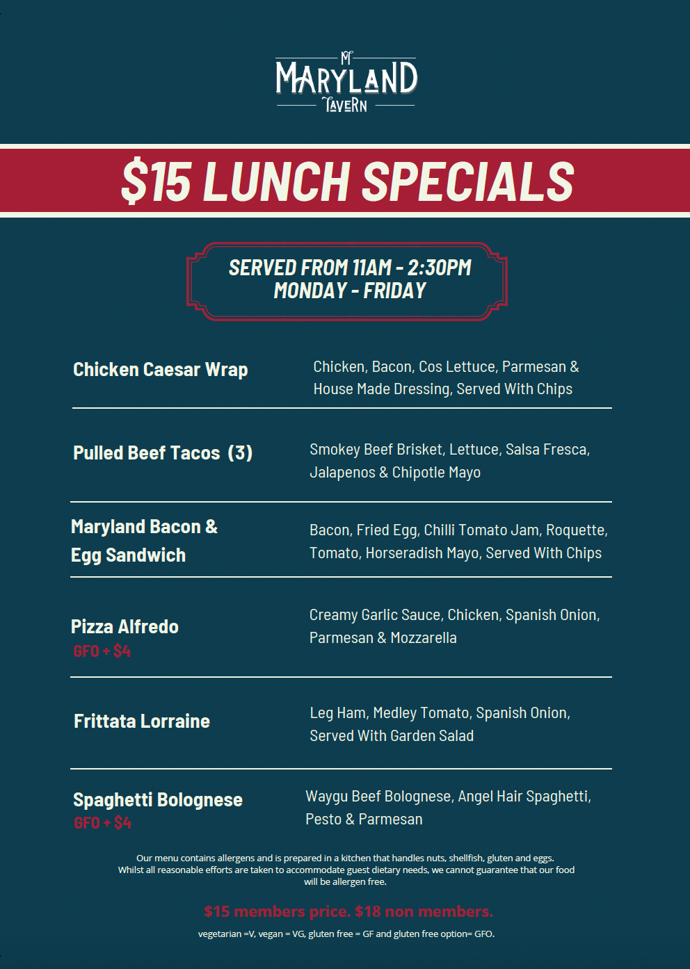Take a break and treat yourself to something delicious at Maryland Tavern. From Monday to Friday, savour a selection of mouth-watering lunch specials for just $15!