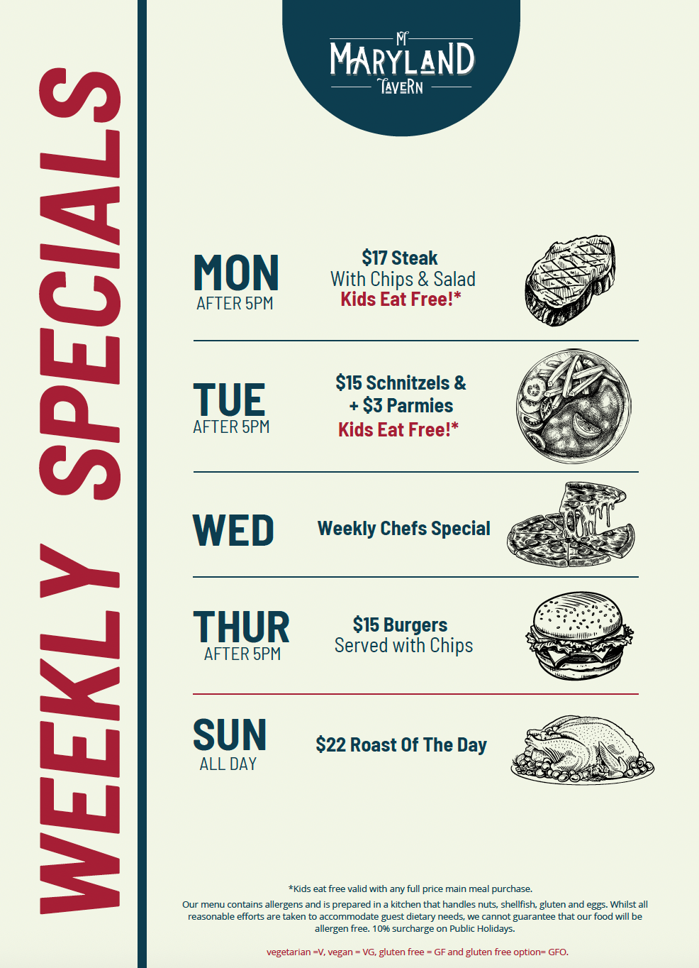 Discover something delicious every day at Maryland Tavern! Join us for a week of mouth-watering specials that promise variety and value.